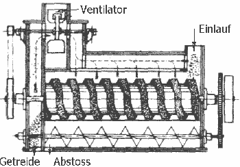 Die BürstmaschineNach der Bearbeitung des Getreides auf Schälmaschinen verbleiben auf der Korn-Oberfläche viele angerissene Teilchen der Schale, des Keimlings und eine bedeutende Menge Staub, insbesondere organischer Staub.Um diese Verunreinigungen zu beseitigen, läuft das Getreide in die Bürstmaschine. Diese enthält umlaufende Scheiben, Zylinder, Kegel oder auch Flügelleisten, die mit Bürsten besetzt sind. Die Gegenflächen werden entweder ebenfalls mit Bürsten besetzt oder aus Schlitzblech, Drahtgewebe oder dergl. gebildet. Das Getreide fällt in einen Spalt zwischen dem sich drehenden Bürstenrotor und dem starren Bürstenteil. Dadurch wird das Getreide einer intensiven Reinigung unterzogen. Seine Oberfläche wird glatt und poliert. Ein kurzer Film zeigt die rotierende Bürste. |